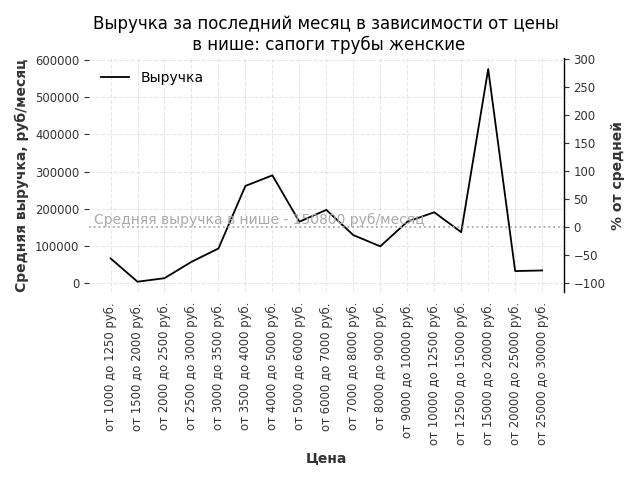Средняя выручка в нише - 150800 руб./месяц. Максимальная выручка 575200 руб./месяц, на 280% больше среднего в нише, была при цене от 15000 до 20000 руб. руб.