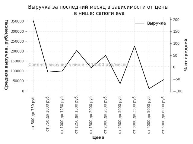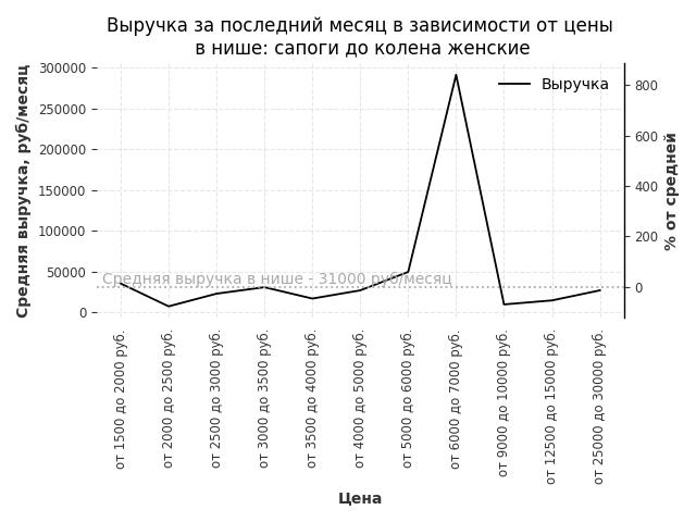 Средняя выручка в нише - 31000 руб./месяц. Максимальная выручка 291500 руб./месяц, на 840% больше среднего в нише, была при цене от 6000 до 7000 руб. руб.