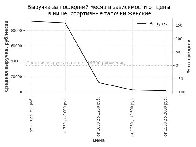 Средняя выручка в нише - 28600 руб./месяц. Максимальная выручка 99200 руб./месяц, на 250% больше среднего в нише, была при цене от 2500 до 3000 руб. руб.