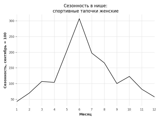 Сезонность в нише сильная. Пик сезонных продаж в нише - июнь. В ближайшие месяцы можно ожидать сезонного спада продаж до 43%.