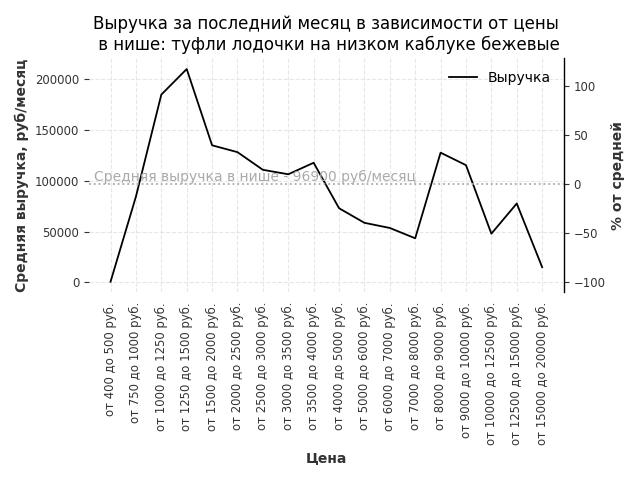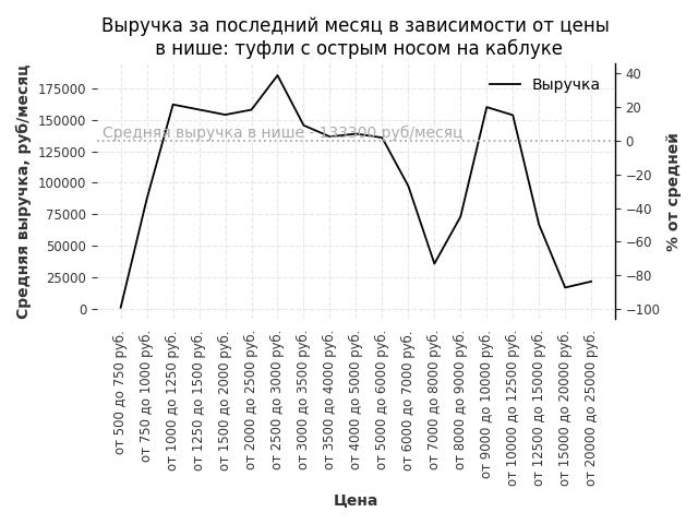 Средняя выручка в нише - 96900 руб./месяц. Максимальная выручка 210200 руб./месяц, на 120% больше среднего в нише, была при цене от 1250 до 1500 руб. руб.