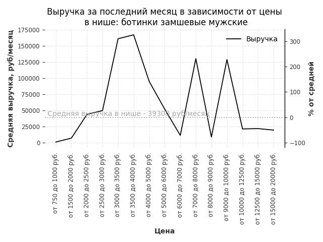 Средняя выручка в нише - 39300 руб./месяц. Максимальная выручка 167300 руб./месяц, на 330% больше среднего в нише, была при цене от 3500 до 4000 руб. руб.