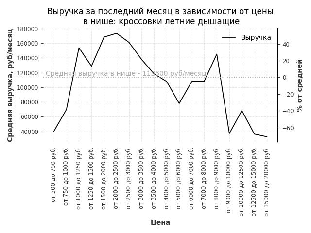 Средняя выручка в нише - 113600 руб./месяц. Максимальная выручка 173500 руб./месяц, на 50% больше среднего в нише, была при цене от 2000 до 2500 руб. руб.