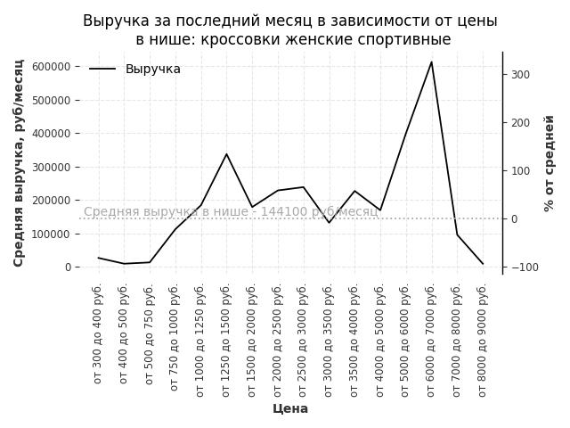 Средняя выручка в нише - 57200 руб./месяц. Максимальная выручка 261000 руб./месяц, на 360% больше среднего в нише, была при цене от 8000 до 9000 руб. руб.