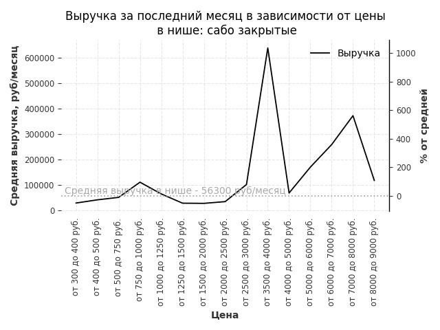 Средняя выручка в нише - 56300 руб./месяц. Максимальная выручка 640100 руб./месяц, на 1040% больше среднего в нише, была при цене от 3500 до 4000 руб. руб.