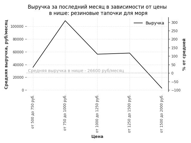 Средняя выручка в нише - 26600 руб./месяц. Максимальная выручка 108800 руб./месяц, на 310% больше среднего в нише, была при цене от 750 до 1000 руб. руб.