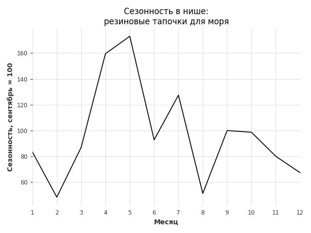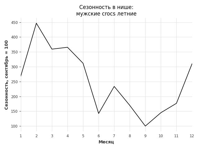 Сезонность в нише сильная. Пик сезонных продаж в нише - февраль. В ближайшие месяцы можно ожидать сезонного роста продаж до 209%.