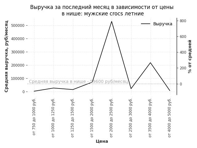 Средняя выручка в нише - 59600 руб./месяц. Максимальная выручка 529800 руб./месяц, на 790% больше среднего в нише, была при цене от 2000 до 2500 руб. руб.