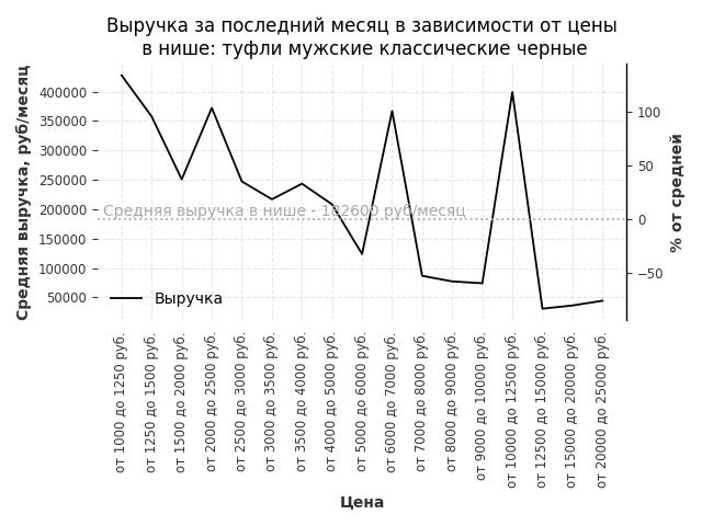 Средняя выручка в нише - 182600 руб./месяц. Максимальная выручка 427700 руб./месяц, на 130% больше среднего в нише, была при цене от 1000 до 1250 руб. руб.