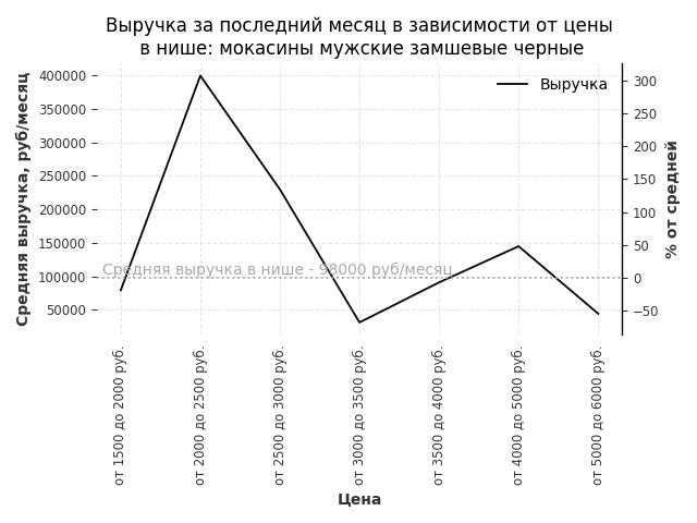 Средняя выручка в нише - 98000 руб./месяц. Максимальная выручка 399800 руб./месяц, на 310% больше среднего в нише, была при цене от 2000 до 2500 руб. руб.