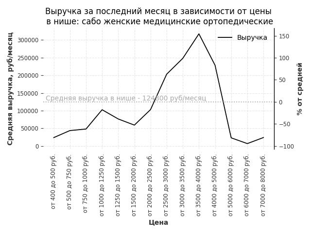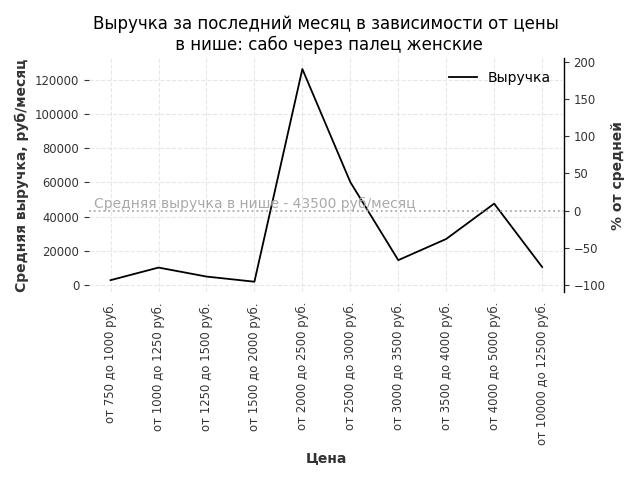 Средняя выручка в нише - 43500 руб./месяц. Максимальная выручка 126200 руб./месяц, на 190% больше среднего в нише, была при цене от 2000 до 2500 руб. руб.