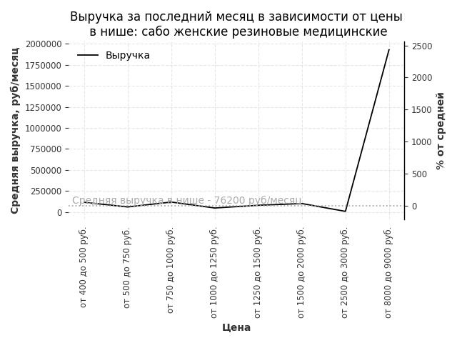Средняя выручка в нише - 76200 руб./месяц. Максимальная выручка 1929000 руб./месяц, на 2430% больше среднего в нише, была при цене от 8000 до 9000 руб. руб.