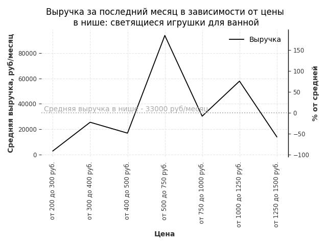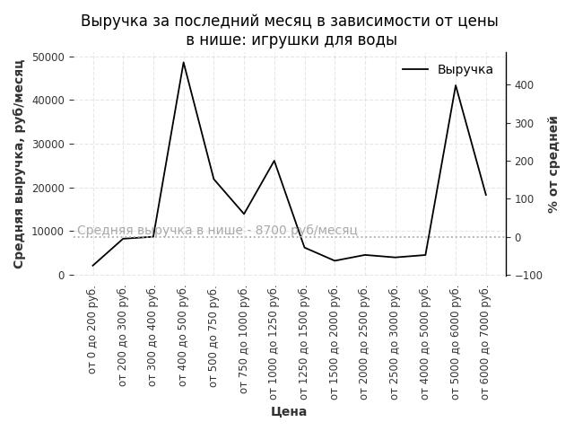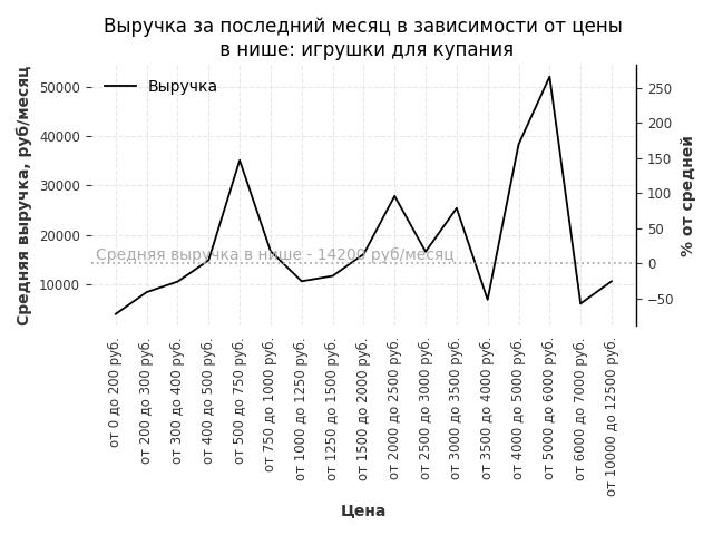 Средняя выручка в нише - 33000 руб./месяц. Максимальная выручка 94100 руб./месяц, на 190% больше среднего в нише, была при цене от 500 до 750 руб. руб.