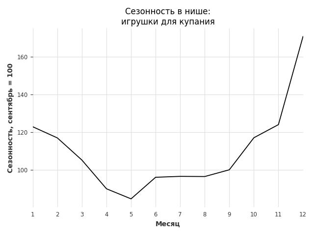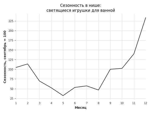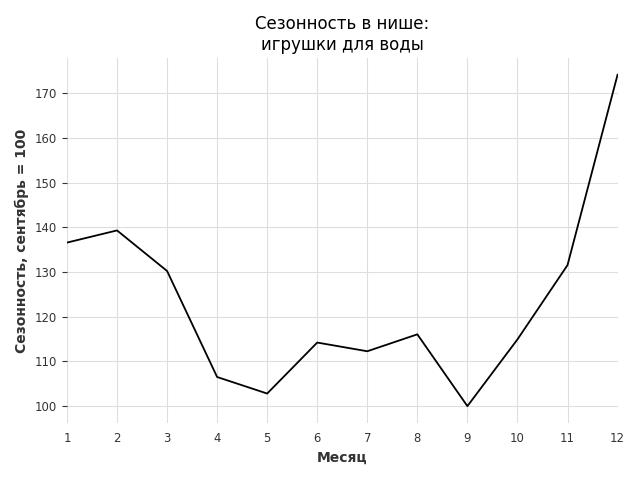 Сезонность в нише сильная. Пик сезонных продаж в нише - декабрь. В ближайшие месяцы можно ожидать сезонного роста продаж до 133%.