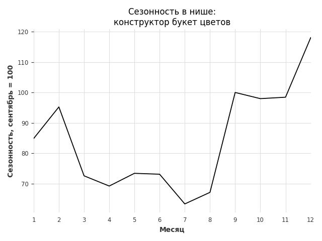 Сезонность в нише средняя. Пик сезонных продаж в нише - декабрь. В ближайшие месяцы можно ожидать сезонного роста продаж до 83%.