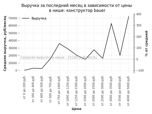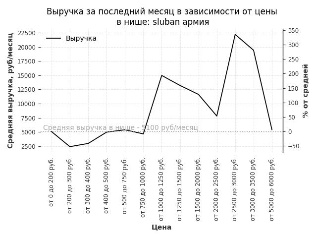 Средняя выручка в нише - 5100 руб./месяц. Максимальная выручка 22200 руб./месяц, на 340% больше среднего в нише, была при цене от 2500 до 3000 руб. руб.