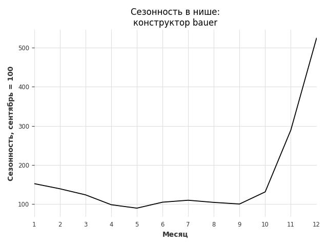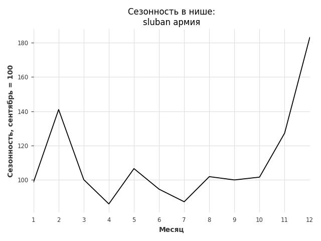 Сезонность в нише сильная. Пик сезонных продаж в нише - декабрь. В ближайшие месяцы можно ожидать сезонного роста продаж до 424%.