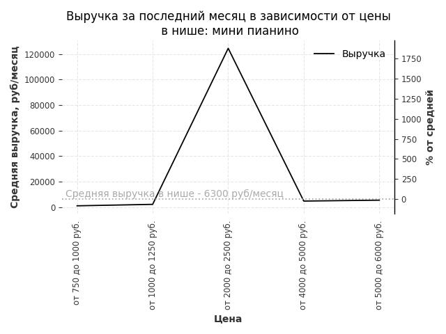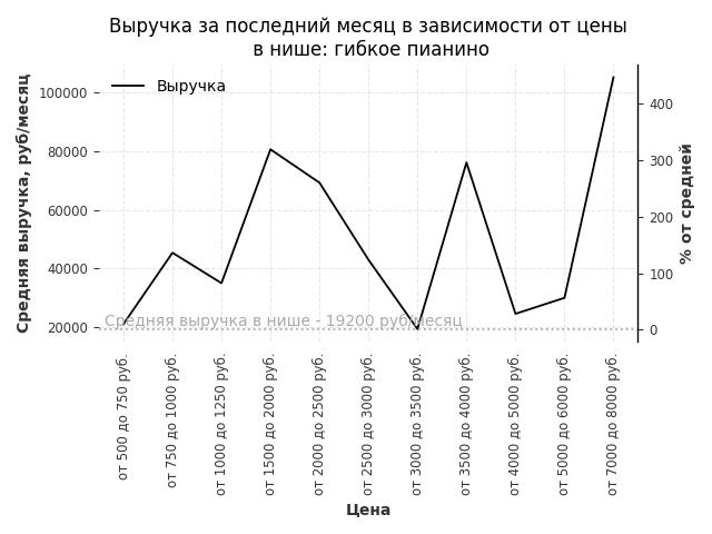 Средняя выручка в нише - 19200 руб./месяц. Максимальная выручка 105100 руб./месяц, на 450% больше среднего в нише, была при цене от 7000 до 8000 руб. руб.