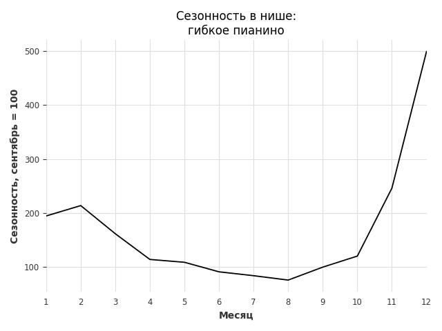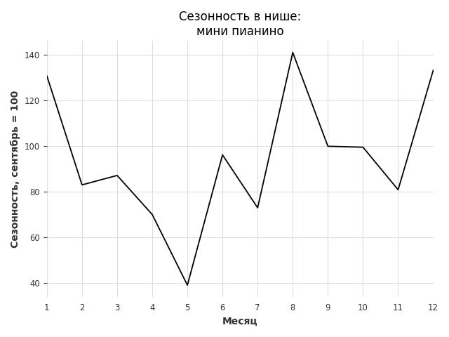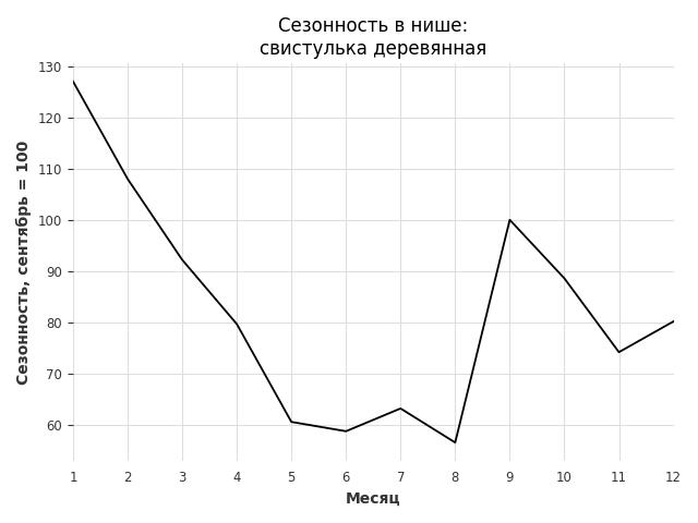Сезонность в нише сильная. Пик сезонных продаж в нише - декабрь. В ближайшие месяцы можно ожидать сезонного роста продаж до 398%.