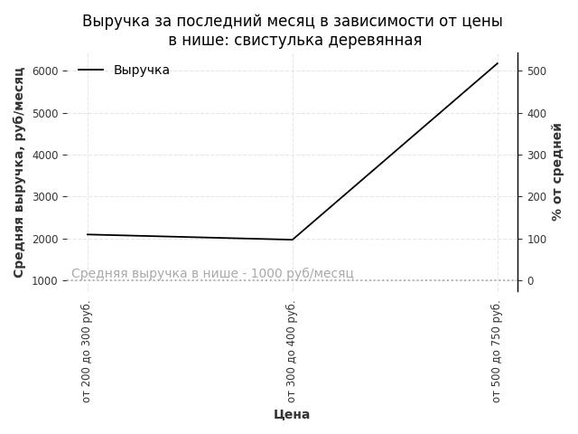Средняя выручка в нише - 1000 руб./месяц. Максимальная выручка 6200 руб./месяц, на 520% больше среднего в нише, была при цене от 500 до 750 руб. руб.