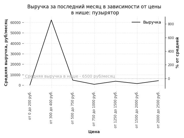 Средняя выручка в нише - 6500 руб./месяц. Максимальная выручка 62300 руб./месяц, на 860% больше среднего в нише, была при цене от 300 до 400 руб. руб.