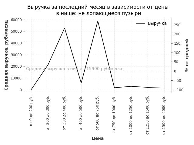 Средняя выручка в нише - 15900 руб./месяц. Максимальная выручка 58800 руб./месяц, на 270% больше среднего в нише, была при цене от 500 до 750 руб. руб.
