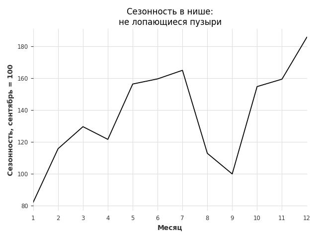 Сезонность в нише средняя. Пик сезонных продаж в нише - декабрь. В ближайшие месяцы можно ожидать сезонного роста продаж до 85%.