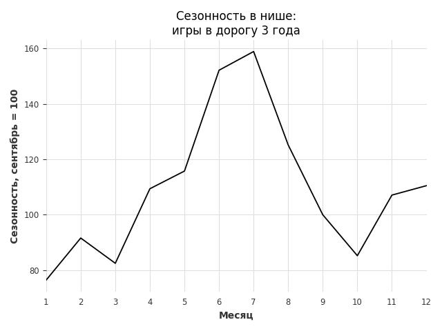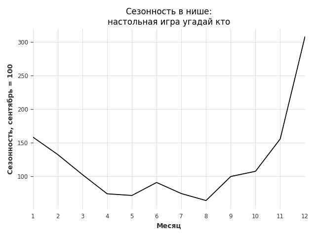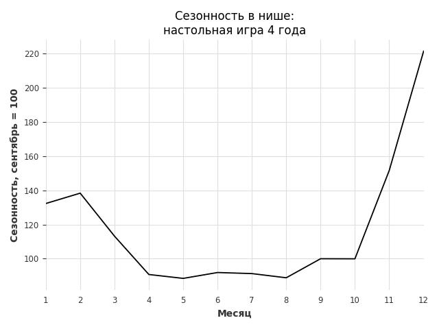 Сезонность в нише сильная. Пик сезонных продаж в нише - декабрь. В ближайшие месяцы можно ожидать сезонного роста продаж до 207%.