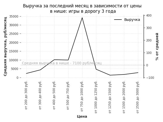 Средняя выручка в нише - 7100 руб./месяц. Максимальная выручка 34200 руб./месяц, на 380% больше среднего в нише, была при цене от 750 до 1000 руб. руб.
