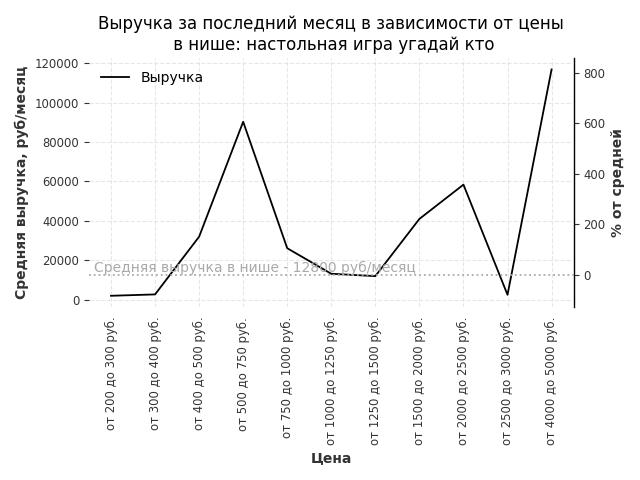Средняя выручка в нише - 6000 руб./месяц. Максимальная выручка 118400 руб./месяц, на 1870% больше среднего в нише, была при цене от 8000 до 9000 руб. руб.