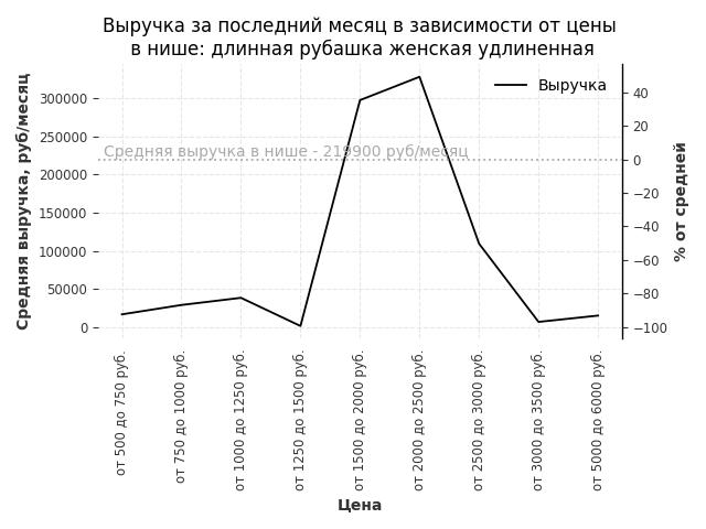 Средняя выручка в нише - 219900 руб./месяц. Максимальная выручка 328200 руб./месяц, на 50% больше среднего в нише, была при цене от 2000 до 2500 руб. руб.