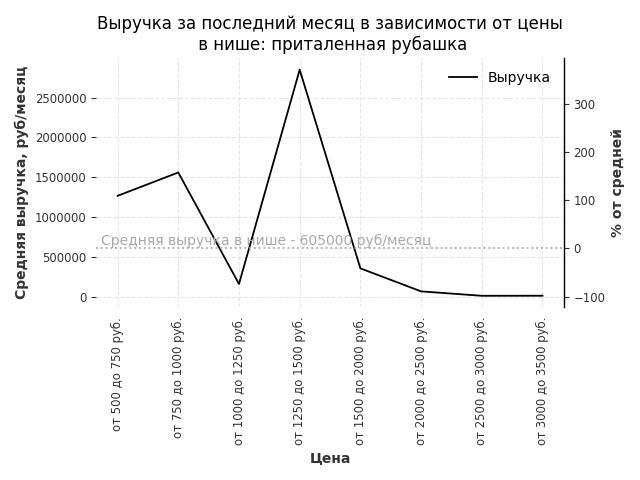 Средняя выручка в нише - 605000 руб./месяц. Максимальная выручка 2848700 руб./месяц, на 370% больше среднего в нише, была при цене от 1250 до 1500 руб. руб.