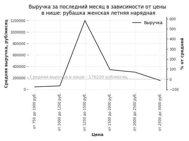 Средняя выручка в нише - 176200 руб./месяц. Максимальная выручка 1202800 руб./месяц, на 580% больше среднего в нише, была при цене от 1250 до 1500 руб. руб.