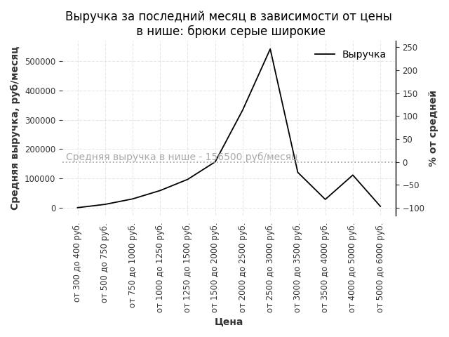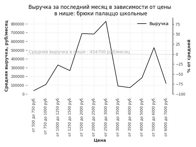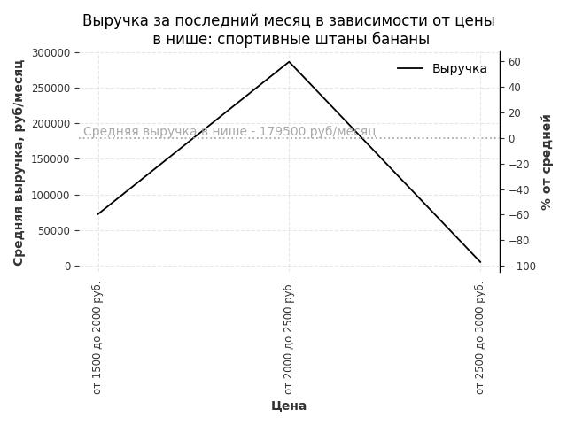 Средняя выручка в нише - 156500 руб./месяц. Максимальная выручка 541600 руб./месяц, на 250% больше среднего в нише, была при цене от 2500 до 3000 руб. руб.