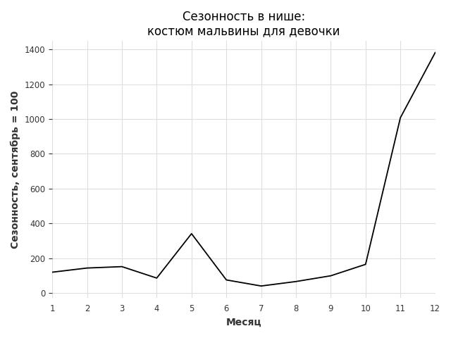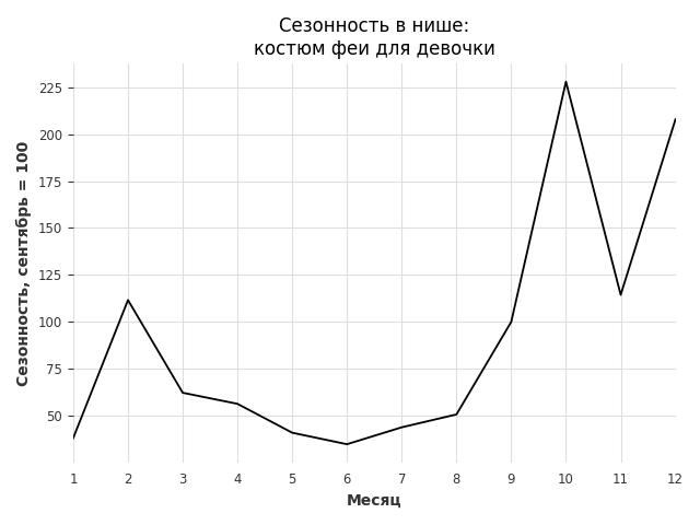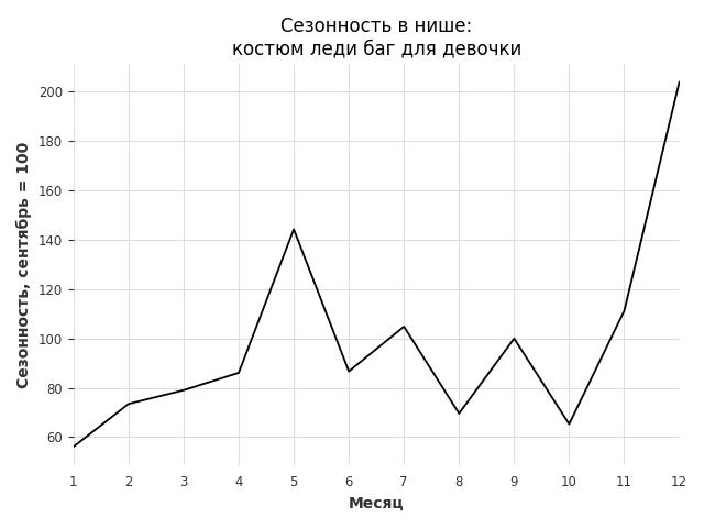 Сезонность в нише сильная. Пик сезонных продаж в нише - декабрь. В ближайшие месяцы можно ожидать сезонного роста продаж до 103%.