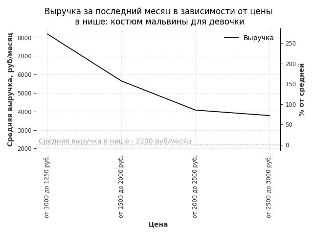 Средняя выручка в нише - 2200 руб./месяц. Максимальная выручка 8200 руб./месяц, на 270% больше среднего в нише, была при цене от 1000 до 1250 руб. руб.