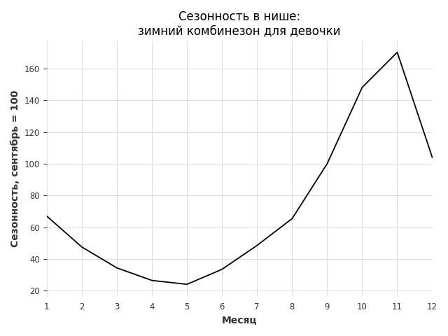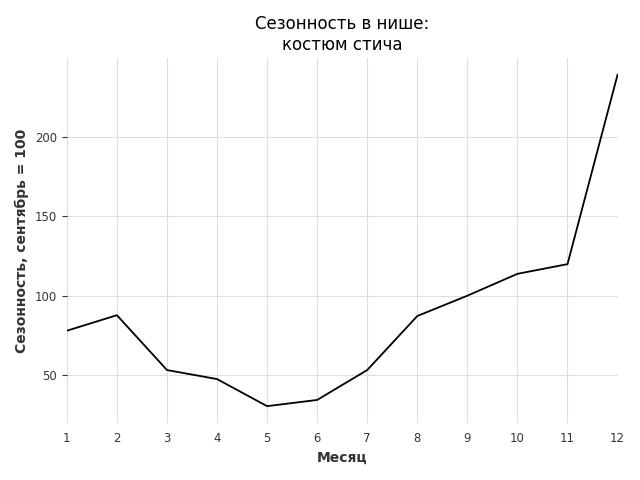 Сезонность в нише сильная. Пик сезонных продаж в нише - декабрь. В ближайшие месяцы можно ожидать сезонного роста продаж до 139%.