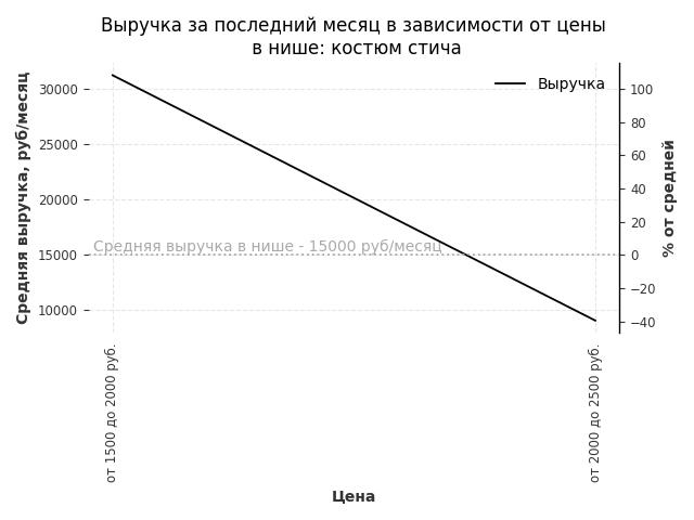 Средняя выручка в нише - 15000 руб./месяц. Максимальная выручка 31200 руб./месяц, на 110% больше среднего в нише, была при цене от 1500 до 2000 руб. руб.