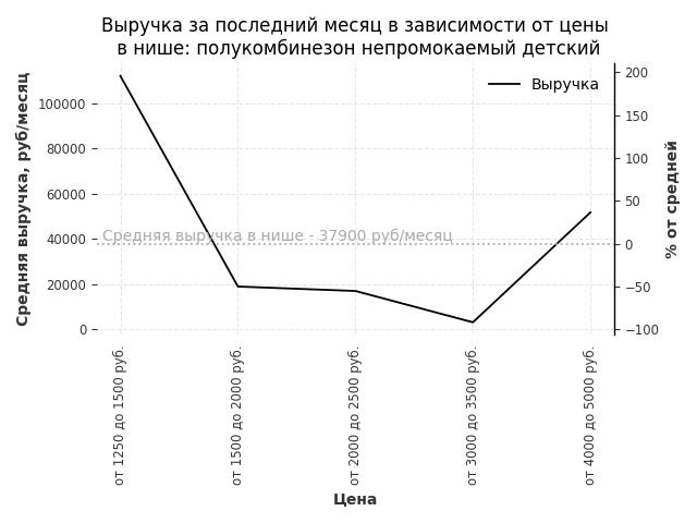 Средняя выручка в нише - 37900 руб./месяц. Максимальная выручка 112100 руб./месяц, на 200% больше среднего в нише, была при цене от 1250 до 1500 руб. руб.