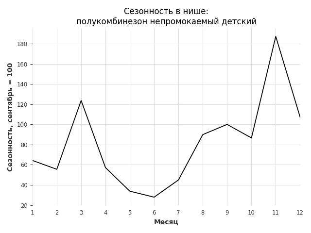 Сезонность в нише сильная. Пик сезонных продаж в нише - ноябрь. В ближайшие месяцы можно ожидать сезонного роста продаж до 87%.
