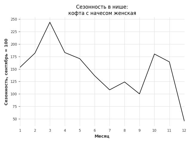 Сезонность в нише сильная. Пик сезонных продаж в нише - март. В ближайшие месяцы можно ожидать сезонного роста продаж до 80%.