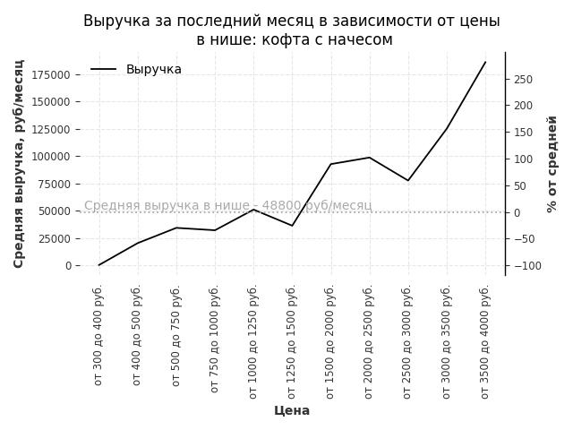 Средняя выручка в нише - 48800 руб./месяц. Максимальная выручка 185800 руб./месяц, на 280% больше среднего в нише, была при цене от 3500 до 4000 руб. руб.