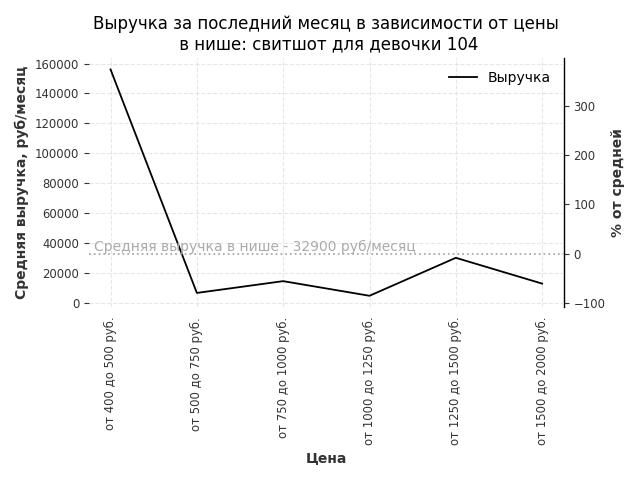Средняя выручка в нише - 74000 руб./месяц. Максимальная выручка 168700 руб./месяц, на 130% больше среднего в нише, была при цене от 1000 до 1250 руб. руб.