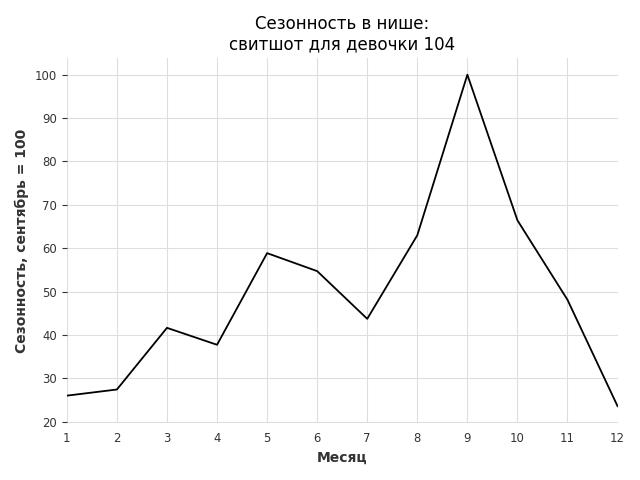 Сезонность в нише сильная. Пик сезонных продаж в нише - сентябрь. В ближайшие месяцы можно ожидать сезонного спада продаж до 77%.