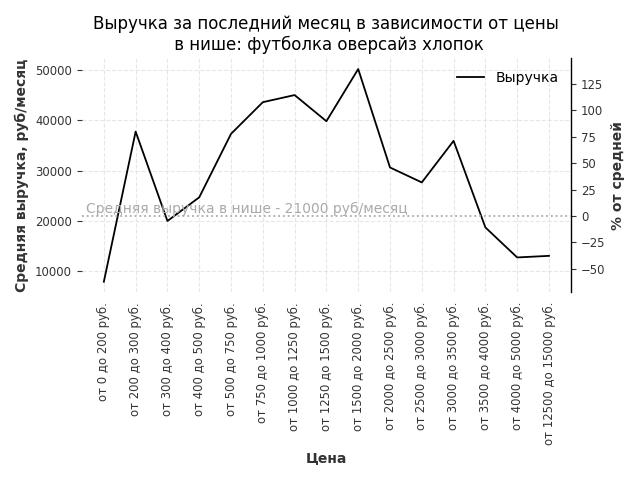 Средняя выручка в нише - 21000 руб./месяц. Максимальная выручка 50200 руб./месяц, на 140% больше среднего в нише, была при цене от 1500 до 2000 руб. руб.