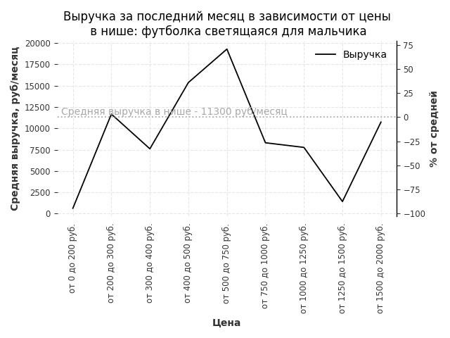 Средняя выручка в нише - 11300 руб./месяц. Максимальная выручка 19300 руб./месяц, на 70% больше среднего в нише, была при цене от 500 до 750 руб. руб.