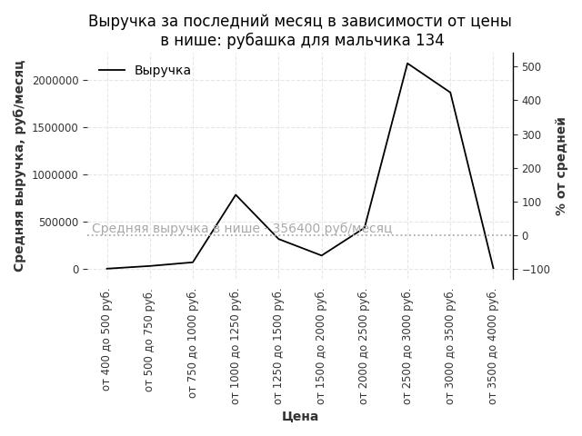 Средняя выручка в нише - 356400 руб./месяц. Максимальная выручка 2172800 руб./месяц, на 510% больше среднего в нише, была при цене от 2500 до 3000 руб. руб.