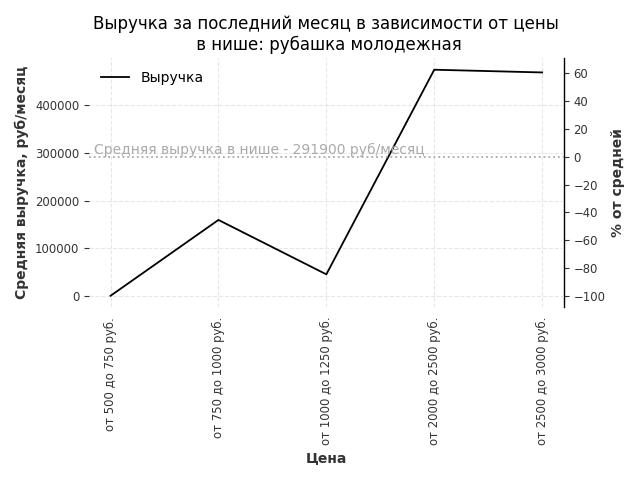 Средняя выручка в нише - 291900 руб./месяц. Максимальная выручка 474100 руб./месяц, на 60% больше среднего в нише, была при цене от 2000 до 2500 руб. руб.