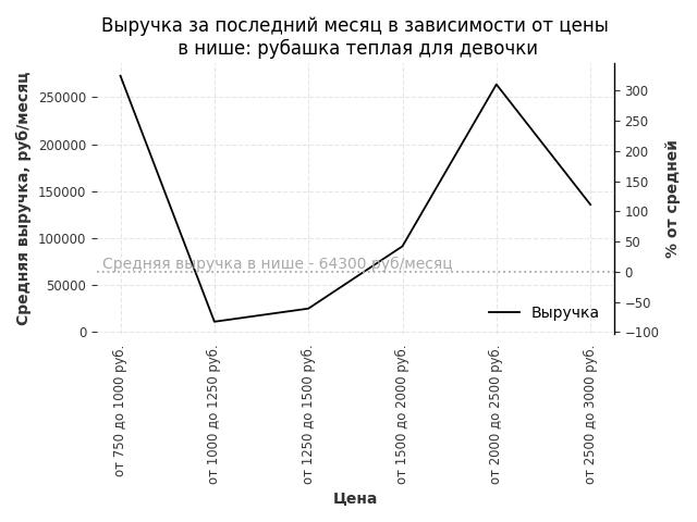 Средняя выручка в нише - 64300 руб./месяц. Максимальная выручка 272800 руб./месяц, на 320% больше среднего в нише, была при цене от 750 до 1000 руб. руб.