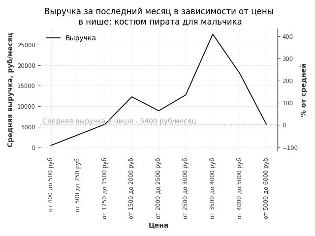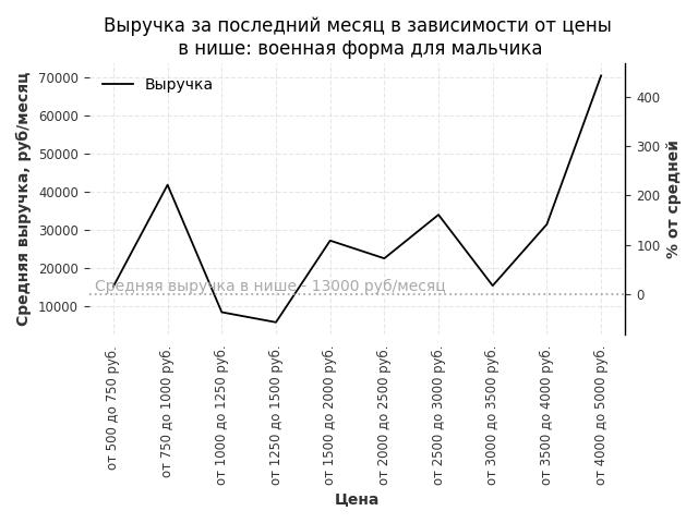 Средняя выручка в нише - 13000 руб./месяц. Максимальная выручка 70500 руб./месяц, на 440% больше среднего в нише, была при цене от 4000 до 5000 руб. руб.